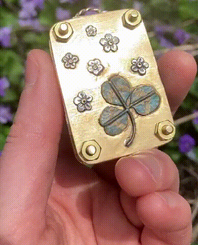 Functional micro flower press locket, hand fabricated in golden jeweler's brass and featuring sterling silver forget-me-not flowers and a verdigris clover leaf.